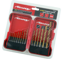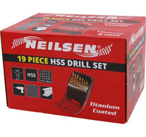 19pc HSS Drill Set 118 degree split point with Titanium Nitride coating Sizes : 1 | 1.5 | 2 | 2.5 | 3 | 3.5 | 4 | 4.5 | 5 | 5.5 | 6 | 6.5 | 7 | 7.5 | 8 | 8.5 | 9 | 9.5 | 10mm Available in display box of 6 sets