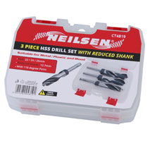 3pc Hss Drill Set Sizes : 22 | 24 | 25mm with 118 degree Point and Reduced Shank : 12.7mm Suitable for Metal / Plastic and Wood
